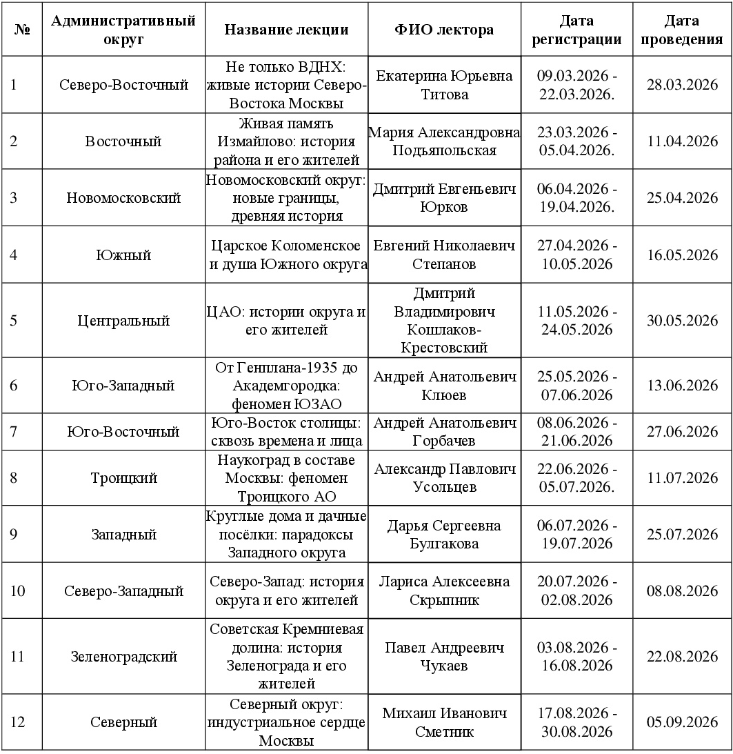 График проведения бесплатных лекций проекта «Москва. Традиции. Люди»