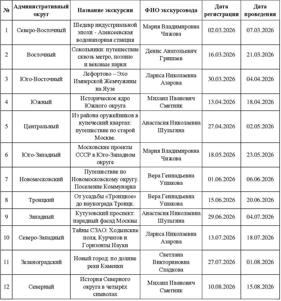График проведения бесплатных экскурсий проекта «Москва. Традиции. Люди»